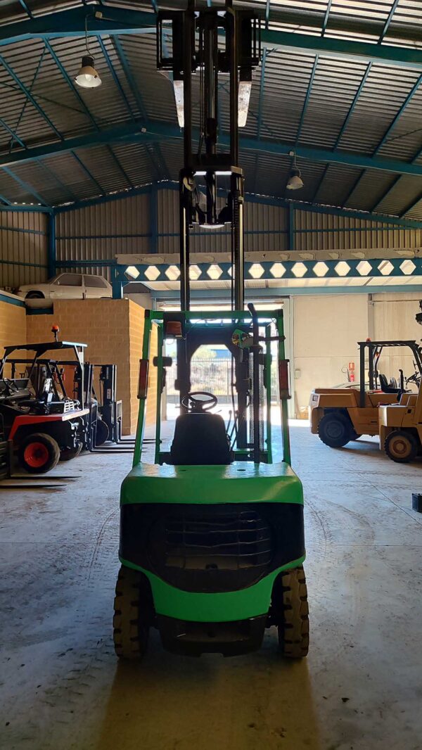 Una carretilla elevadora diésel industrial es un vehículo contrapesado en su parte trasera alimentado por un motor de combustión interna de ciclo diésel diseñado para transportar, elevar y apilar cargas pesadas, generalmente en entornos industriales o de almacenamiento.